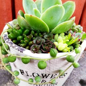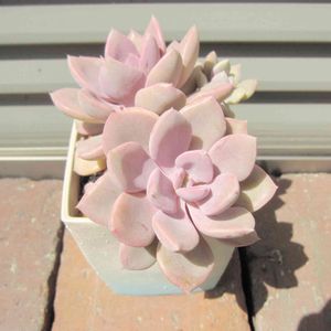昨日買ったにゃんこ鉢🐱 何植えるか悩んでたんだけど、テラコッタとはいえ底穴が無いのが不安なので我が家で1番剛健なグラプトさん達を寄せ植えしてみた(・ω・)ノシ ブロンズ姫はちょっと日陰に居たから色が緑だけど日が当たる所に移動したから可愛くなるはず(笑) 真ん中の桜月の淡い色が可愛い💕 サンキャッチャーをピックにさしてお気に入りの寄せ植えになったかな♪ 大満足❤️