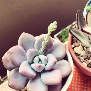 グラプトペタルム属 ムラサキ🌱 この子を撮ろうとしたら、偶然のピンクゾーン🤭💓 この色系の子たちには、先月からオルトランDXをパラパラ~と月一で🎶 この子は昨秋にお迎えしたので今年が初めての夏越し。棚の最前列で積極的に直射日光に当ててます🎵油断大敵ですけど、今のところ好調です😆 段々と撮影意欲がなくなってくる季節に突入してますけど、今の時期にこの色は嬉しい😊💕 「たっちんのムラサキ」タグをタップでこの子の生長記録のみどりのまとめが簡単に見れます😊🎵