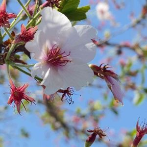 蒼空に 桜に囲まれて、 ジューンベリーの花が❣️ もう散り際でしたが😅