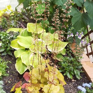 2年目のヒューケラ 初めてお花が咲いたよ♪キュン♡ 葉っぱの色とお揃いの色なのね 緑の子はハクサンさんからの当選PW苗 順調に成長しています☺️