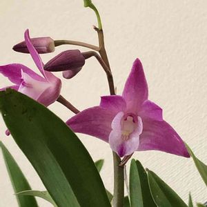デンドロビウム スペシオキンギアナム系 の'さくらひらひら'が1花茎だけ咲きました。 スペシオキンギアナム系は大変丈夫で、暑さにも寒さにも強く、我が家では他の蘭を取り込んでも5℃を下回りそうになるまでは外に出してます。 この花茎は秋から1本だけ伸びてきたものですが、屋外で低い温度にあたったので濃色に咲きました。 他の花茎は室内に取り込むと暖かくなったと思って、一斉に動き出します。 もう少し薄い、さくらひらひらの品種名のとおり、柔らかいピンク色で咲きます。