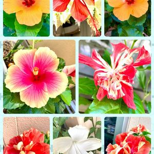 🌈色とりどり続く🎊🌈 1枚目pic 上から パンプキン スノーフレーク 中段 ミセスユミ ハワイアンフラッグ 下 昨日は咲きかけやった アポロダブルが2個一緒に開花🎊 下真ん中 清楚で優雅なホワイトバタフライ 2枚目pic 大きな株のペインテッドレディ 八重咲きオレンジフラミンゴ どっちも私より大きいから 花も見上げる場所に。。。😂 pic撮るのが大変😆 ハイビスカスカウント 307❤️ 3枚目pic ずーっと咲き続けるサンパラソル💕 手前は スーパーで買った台湾パイナップル🍍を水差しして 春から鉢植え外🪴 何回チャレンジしても 今だにパイナップル🍍の花は見たことない😆⤵️