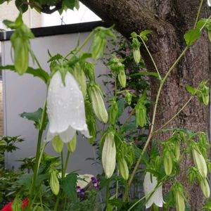 柿 クレマチス ホタルブクロ ‼️柿の木を挟んで 咲いています😊 植えっぱなし組ですが…