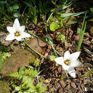 原種系チューリップ`ペパーミントスティック´が咲きました 植えっぱなしの球根で葉茎が細く倒れかけています