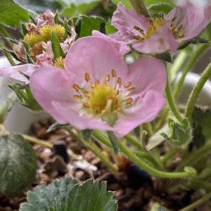 🍓のどか やっと綺麗なピンクの花になりました。 冬も咲いて実を付けていましたが、クチャッと小さく枯れ色の花で、味の無い実でした。 根が張りすぎて溢れ始めたので、暑くなる前にと、先月末に分割したばかり。 この春は無理かなと諦めていました。 これからまた美味しい実を付けてくれるかな。