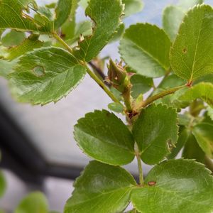 ジャスミーナ🌹 かわいい、強い薔薇ですが、 ありゃま、‼️ 両端の蕾が食べられてる😱 犯人は?誰? 多分、最近よく見かける ホソオビアシブトバチ💢 水やりするたび枝に擬態する奴を いろんな薔薇で見かけ 補殺😱 じーっと見てると見えてくる🐛😱