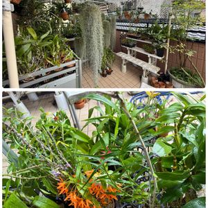 ①②ベランダの密林 蘭ハンター(私)が蘭の花を発見🔭👀 ベラマリーでした😊 ③④前回咲いたブラッシアが満開 リーゼントの宇宙人👽がベロ👅を出しながら集団で居ます🤣🤣🤣 (7/21参照) ⑤今日のベランダは56度🥵 (6/21は44度でした) デンドロの新芽も暑さでやられたり、ポトスの茎が黒くなったりしてます😱 ザッと夕立🌧️お願いします🙏