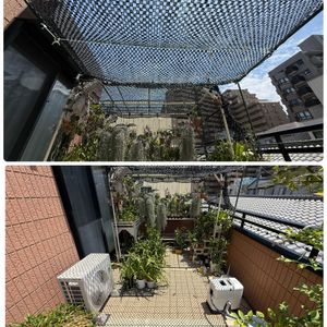 ①ベランダの洋ラン😊 久し振りの雨が気持ち良さそう ②洋ランつぼみ 成長が早い🫢 ただ今日は風が強く🌪️ペチュニアの花が飛び散ってました😱 ③遮光ネットが飛ばされない様に、半分だけ外しましたよ