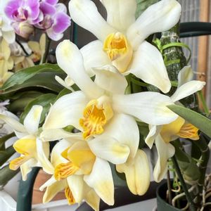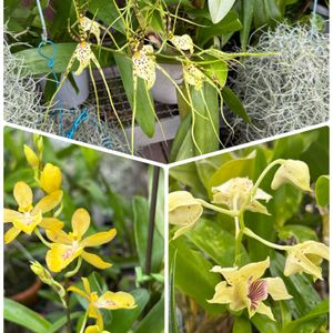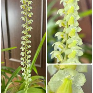 ①セロジネ(旧デンドロキラム)コビアナ 開花しました😊 淡いグリーン花が綺麗に2列、垂れ下がって咲いています🎶 ②③冬の洋ラン置き場 寒くなる前の一昨日シンビジウムも取り込みました❄️ 廊下は壁面やぶら下げたりしてスペースを確保してます😅