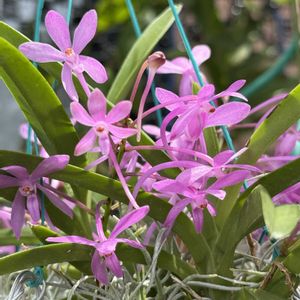 Ascf.Cherry Blossum アスコフィネチア チェリーブロッサム ①②チェリーブロッサムが咲き揃いましたので1箇所に集めて集合写真 バスケット植え2個、コルク板と鉢植えがそれぞれ1個咲いています🎶 まだ蕾の鉢もあります😊 ③もう直ぐ梅雨なので遮光ネットを外しました😊 突然の太陽☀️には気を付けないとね ④コの字に蘭を置いてます 立体的に壁側ネットと天井支柱からぶら下げスペースを稼いでますよ そうそう、蘭展で購入した鉢のラベルは4年位で劣化し、折れたり印刷が消えてロストラベル🏷️になるので 購入と同時に追加で新しく書いてます😊