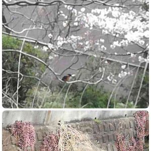 桜をみていたら青い鳥🐤 かわせみー 会いたかった~✌ スマホの限界で、画像が粗すぎて綺麗な青が出ていないのが残念😅 魚をとる瞬間も見られたし、素敵な出来事でした❤ 下はポリゴナムが群生している所😆💕