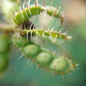 オジギソウの種を見るとマメ科そのものです。 でも、枝だけでなく種にもトゲトゲが沢山あります。