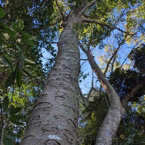 神社の林に~立派なヒメユズリハが何本か…生えています♡ 木肌の上の方まで丸い面白い模様がついていました‥👀!! 日当たりを求めて~上へ上へ…枝葉を広げています🌳 不要な枝を自分で落とす「自己剪定」の痕がそのまま残った…落枝痕なのかな‥🤔?! 不思議な模様だな‥🙄 足元には沢山の藍黒色の実が落ちていました‥⚫ ヒメユズリハ(ユズリハ科) ユズリハ属