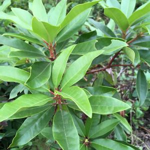 この植物の名前を教えてください! 樹木です。 葉は長細く、付け根が赤いです。