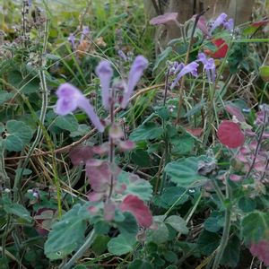 春に咲いたのにまた咲いて、狂い咲きのようです。 紅葉の葉っぱもなんだか良い👍 コバノタツナミソウだと思います。葉っぱに、び毛が多いし、背が低いので。