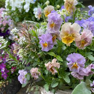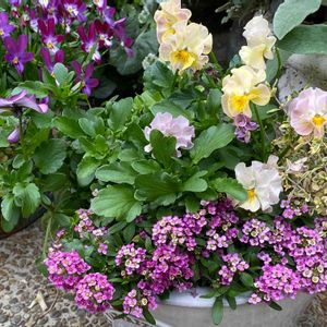 雨上がりの朝です〜 雨降る前に軒下に入れておいた寄せ植え 濃い紫〜手前パンビオさん ようやくたくさん開花してきました😌