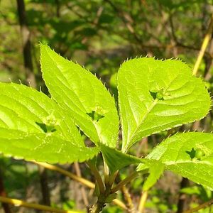 *ハナイカダ(花筏) 若葉にちょこんと、花を付けてました🌱 各葉に1個ずつなので、雌花みたいです😊雄花は数個つくようですね🐦 花言葉…気高い人