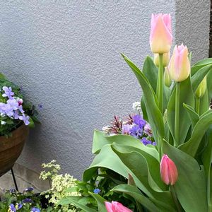 おはようございます🌥 原種系チューリップ🌷 2年目〜 大好きなんだけど… 蕾の時は上へ真っ直ぐだったのに開花し出すとクネクネ💦 せめて同じ方向に靡いて欲しいんだけど… 寄せ植え💜ビオラと🤍シエルブリエ アネモネは4回目の蕾が〜 皆んな頑張ってくれています🤗 ラムズイヤー ワスレナグサは未だ蕾です😅 庭に出るとなかなか離れられ無い… 今日は荒ゴミの日だった🤭 危ない!危ない!急いでゴミ出しに… 行く道の何処の🏠も お庭が華やいでました🌷🌷🌷