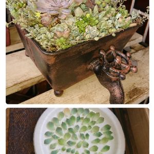 去年の11月ごろに🌱葉さしでそのまま寄せ植えできないかなっと思って、色々ならべて作った寄せ植えです。 まだ葉っぱついたまま子ばかりですがだいぶ大きくかわいくなりました💕