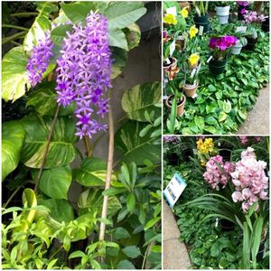 ⬅️🌿巨大化ポトス✨ (今日のお花 過去pic📸) 🫢ペトレアの背面のどデカい葉はポ ト ス(*◇*)v 下草にライムポトスを地植えしたらライム色も消え先祖返り😂 3階まで這って登る🧗南国あるある🏝️〜 ↗️↘️蘭の展示会場(過去pic📸) 🪴下草のグリーンはポトス🌿〜いい仕事してますね💪