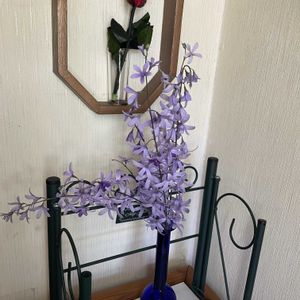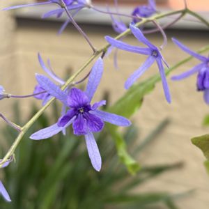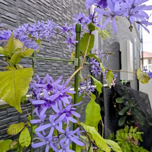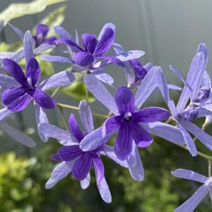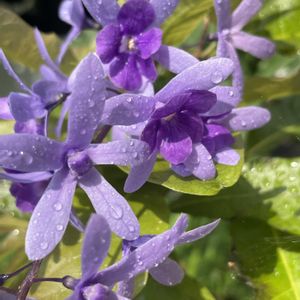 雨上がりのペトレア 少しだけどまた咲いてくれました🤗 今朝は少しの間しっかり雨が降ってくれて水やりを手抜きできました。 今は晴天☀️今日も暑くなりそうです 室内で咲いた時より花色が濃いわぁ〜、やっぱりお日様の力はありがたい