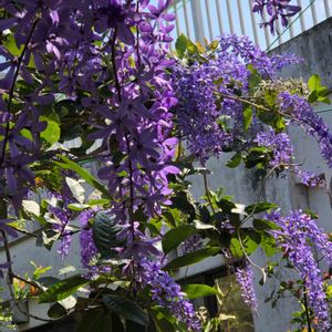✨ペトレア✨2メートルの枝一本に葉っぱ数枚と一房の花(一目惚れ♡)がついてるのを育つかどうかもわからないのにお連れし約10年。一階に地植えし紐一本で二階フェンスへ。4、5年は沈黙お花つかずその後お花ついたらこのボリューム💜💜💜 100pic記念『ペトレア4/28』をアップ💚 見て下さって感謝💕感謝です😊💕