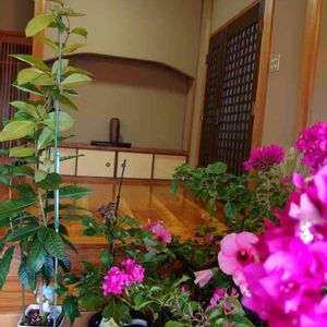 避難中の花! まだまだ外は突風が吹き荒れてます!玄関には少し、車庫に入り切れなかった😩 和風の玄関、ピンクで染まってます♪♪♪(笑う)