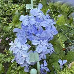 【ルリマツリ(瑠璃茉莉、プルンバゴ)】 南アフリカ原産、イソマツ科常緑低木 初夏から秋にかけて、長い期間にわたってブルーや白の涼しげな花を咲かせてくれる。 花数が少なくなってくる真夏でも、暑さにも負けずたっぷりと咲く生命力旺盛な花木。 名前の由来は、瑠璃色であることと、ルリマツリの花がジャスミン(茉莉花)の花に形が似ていることからきている。 樹高:50cm~3m 花色:白,青,紫 開花時期:5月~11月 ご近所さんの庭先