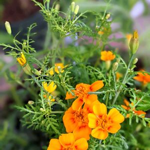今日のお花 マリーゴールド ハーブ教室で寄せ植え.•*¨*•.¸¸♬マリーゴールド・タンジェリン・ジェム🌼柑橘系の香りの葉🌿小花は食用となり、サラダに最適🥗 植え付ければ土中の線虫を駆除する作用がある。2022年5月