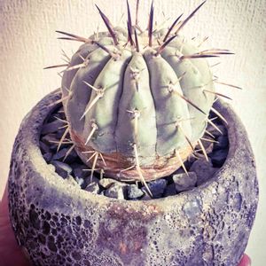 今回のお出かけでのサボとの出会いの中で一番嬉しかったのはこの黒王丸。 コピアポアの代表かってくらい有名ですよね。 まだほんの小さな、ダイソーサボと同じくらいのサイズで、後学のために帰宅後ひっくり返してみたら殆ど根っこがなかったので、植え付けられたばかりだったようです。 コピアポアが日本で出回り始めたのは(私的に)割と年数が浅いですし、まだ育てたことが無いんですよね。 (『出回る』についての解釈は、こう言う物の場合、そのお人お人によって基準や尺度が違うと思うので、『私的に』です。) 育てられたとしても、格好良く育てられるかどうかはまた別のお話ですから、フェロカクタスですらイマイチ格好良く育ててあげられない私は全く自信がないのですが、黒王丸にしては低めのお値段と、育ててみたい衝動に勝てずに連れ帰ってきてしまいました。 が…がんばろっと💦