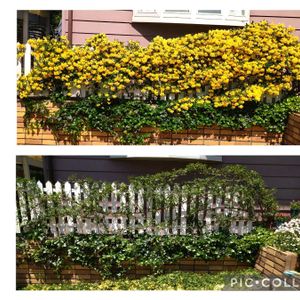 モッコウバラ剪定! 写真では驚くほど黄色がまだピカピカですが、近くから見るとクスミ、触るとパラパラ落ちます! 2時間掛けて剪定! 大量の剪定クズはPM.穴を掘り土に返し肥料にします!