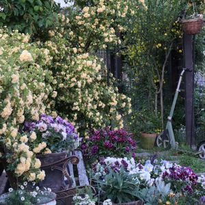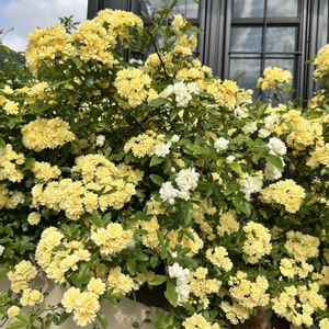 ⌘木香薔薇 鉢植えだけど、目一杯枝を伸ばして 頑張って今年も可愛い花を 沢山付けてくれました💛*ˊᵕˋ* ありがとうって気持ちが溢れます𖧧˒˒.