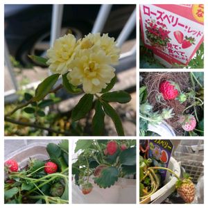 苺の苗に葉が今無くなり 過去写真からpick No2001 🏷今日のお花 黄色い薔薇🟡 🏷毎月15日はいちごの日 🍓 ↖️過去に咲いた黄色🟡のモッコウバラ ↗️📛の🍓苗は➡️、⬅️、↙️ ↘️は’25.2/に実が出来た🍓苗テラスベリー桜香という品種です 今日も見に来て下さりありがとうございます(^∇^)