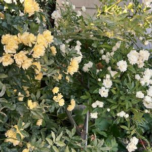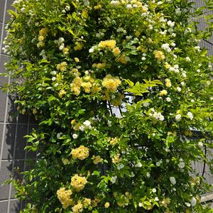 我が家のアーチモッコウバラ💛🤍💛🤍 もう少しで満開♪ヽ(*´∀`)ノ 黄色と白色をマーブル仕立て🤗 昨年より大分ボリュームが出て、花数もアップ🤭⤴✌ 段々いい感じになってきたかなぁ~😆 先日4/25蕾のアーチモッコウバラを投稿(*^^*) 今夜から雨予定なので本日📸