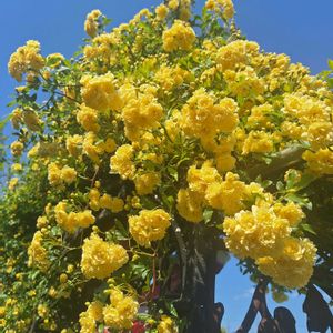 こんにちわ|ૂ•ᴗ•⸝⸝)" いま余りにも退屈でw クローゼットの整理をして 冬物洗濯しました。 今からなので部屋干しではなく 外干しするのに外へ出たら なんとまぁ こっちからの(どっちからだよ🤣) 角度のモッコウバラが 満開ではないですか‼️ 驚いたぁΣ(゚∀゚ノ)ノキャー💕 青い空とモッコウバラが 幸せをくれました (◍•ᴗ•◍)ꕤℍ𝕒𝕡𝕡𝕪ꕤ