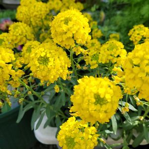 こんばんは😊 🏷日曜ビタミンカラー♪ 元気パワーお届け(💪・▷・) 水やり前に(*ˊᵕˋo📷oパチリ✦* ①黄色アリッサムもりもり💛 ②ペチュニア💛🍃 ③オステオスペルマムキララ🌼*・元気 ④モッコウバラ連投🙇♀️ 満開~キレイ✨🌼*・ ⑤ミネルバ🌼*・満開元気いっぱい🌼*🍃🌼*🍃・🌼*🍃・🌼*・