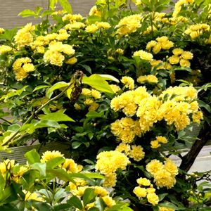 少し見ないうちに…モッコウバラが満開🤗 フェンスに無造作に誘引し地べたへ垂れてたものをサンルームの屋根へ誘引し…くちゃくちゃですが…綺麗 夜な夜な爺に振り回されて🥱眠いけど これ見たら頑張れるぅ💪😊 花終わったらバッサリいくよ! 長く咲いてね🤗