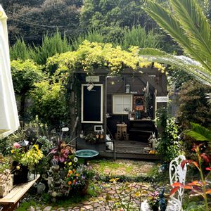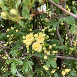 今年初めてのバラ💛モッコウバラを見つけました🥰 玄関入って左側 木の陰に隠れんぼ🌳 4枚目⋯ 見えますか🤣 もう少ししたら 隠れられなくなるかな😆🌹💛