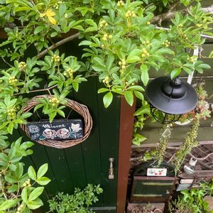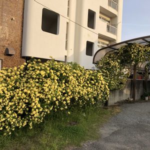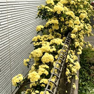 モッコウバラ 1本だけ中庭のパーゴラまで伸びて来て 中庭廊下やリビングから楽しめます 和室の横なので道路から楽しむだけなので、こちらに誘引するといいなと思いまずは、 1本です いい感じなのでこちらに伸ばしたいです