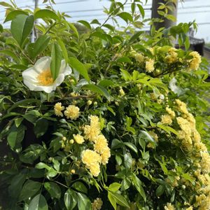 黄モッコウバラ 白モッコウバラも隣に植えてますが こちらの勢いがすごい👍 白は遅れて しかも少ししか咲かない😅💦 とりあえず綺麗な黄色モッコウバラ 満開まで楽しませてもらいます😊 白の開花もお楽しみに👍