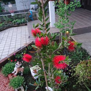 こんばんは😃🌃 ブラシの木が沢山の花を咲かせてくれました❣️真っ赤で可愛い💞バラやゼラニウムも地植にしたらみんな元気になりました☺️ マジョールの花も真っ盛りです