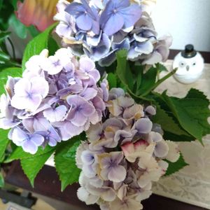 ②投稿目です 6月8日に初々しい色の 紫陽花を投稿したのですが 四日間の猛暑でこんな色になってしまいました 4階に住んでいるので毎日お水を揚げられなかった結果でしょうか 可愛そうなので部屋に飾りました 福ちゃん🦉もご苦労さまと…。◕‿◕。🌺