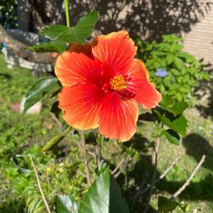暑いですね。 オレンジのハイビスカス🌺が今年最初の花を咲かせました。 朝6時の時点ではまだ蕾の状態だったのに、7時には写真のように元気に咲いていました。 根詰まり気味だったので、春に植え直したところ、今はすっかり元気に青々と葉を広げています。