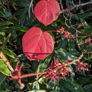 里山で木に咲いている赤い小さなものが目に止まりました。 アカバナマンサクの花に似ています。 よく見ると二つの花が背中合わせに咲いています。 Google検索によると 「ベニマンサク(紅万作)」と出ました。 別名: マルバノキ(丸葉の木) マンサク科 マルバノキ属 秋の紅葉が美しいとの事、見逃しました😆(落葉する頃に花が咲く) 原産地:日本固有種 花言葉: 「早熟」「幸福の再来」 葉の形: ハート型💚