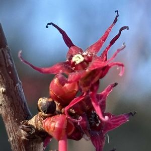 マルバノキ ベニマンサク マンサク科 今年も百日紅さんのpicに刺激を受け、昨年は12月5日だったのですが早めに逢いに行きました😍🌸 一つの所に背中合わせの5枚花弁の不思議な花が🌸 思いっきり拡げましたので結構不気味😍🌸 とても小さな花です🌸 紅葉する頃に咲きますが葉っぱはかなり少なめです💕 牧野植物園