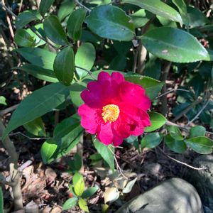 茶花として有名なツバキ「隠れ磯」 名古屋城の椿展で見つけて連れ帰ってきました。なかなかの大苗😅 光沢ある小豆色の花弁に澄んだ白覆輪。濃い色の花弁脈もいい感じです。なかなか画像では再現が難しい色合いです。