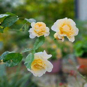 おはようございます☺ お題に……黄色いバラ🌹 風恋花 和み ロアルド・ダール ファンタスティック 淡翠 今年の春バラ🌹達…現在はカット✂😌✨2番花待ち ずっと雨続き💧本日、貴重な晴れ☀…なのに仕事😭お庭でしたいこと山モリなのにね~😓