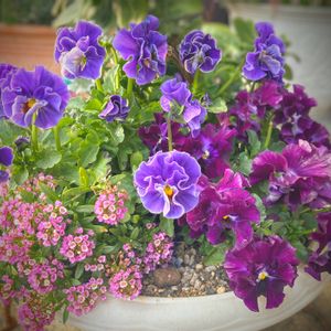 今日のお花 パンジー❁⃘*.゚ 寄せ植えです❁¨̮ 11月にお迎えしたパンジー2種 こぼれ種っ子のアリッサム そして後ろにはオステオスペルマムが植えてあります𖤣𖥧𖡼.𖤣𖥧 最近花数が増えてきた フリフリ系のパンジーたち⁎ .。❀ * ここのところの低温で花弁が傷みがちですが なんとか耐えています(*•̀ᴗ•́*)👍 うしろのオステオさんは昨年からうちにいる子で何色の子に入ってもらったかわからなくなってしまったけど…😅 もう少ししたらみんなで咲いてくれはず(ˊᗜˋ*)و⚑" どんな感じになるのかな〜? 楽しみです❀.(*´▽`*)❀.