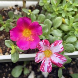 ①ポーチュラカ 色はMIXの花苗をひとつ 初めて育ててます╰(*´︶`*)╯♡ 可愛いい色合い🩷 7/3 ② 紫色のペチュニア💜 ピンク色のペンタス🌸 7/3 ③ ピンク色のペチュニア💗 7/3 ④ 2年目のプリムラジュリアン🌼 暑い中〜蕾が付いてます😆 7/5 ⑤ 3年目になるF1ガーデンシクラメン🌸 葉っぱ☘️をよけると 蕾がありました😃 今朝 7/5 📱