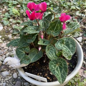 3年目の冬を迎えてる F1ガーデンシクラメン🍀 今夜 12/27 の様子🌿 2022年12月初めに一株花苗を買って 寄せ植えにしてました🌸♪(๑ᴖ◡ᴖ๑)♪ 昨年5月に 寄せ植えから独立させて花が咲き🌸 不思議と 今も こんな姿🪴ですが蕾があります٩( ᐛ )و さぁ 3回目の冬 ピンク色の花を また見れるかなぁ?💕😆